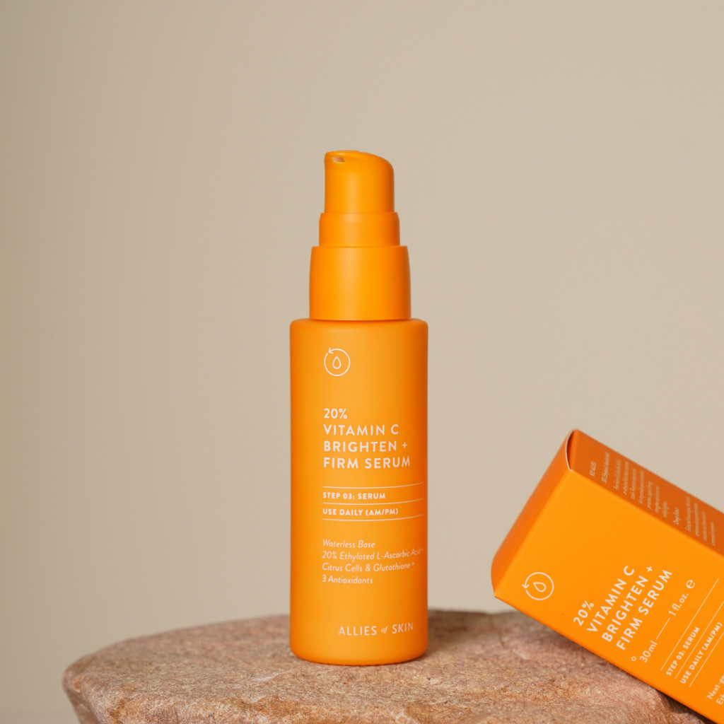 Сироватка нового покоління Allies of Skin 20% Vitamin C Brighten & Firm Serum з вітаміном С, збагачена цитрусовим комплексом, глутатионом і 3-ма антиоксидантами для ще більшого сяйва і молодості шкіри.