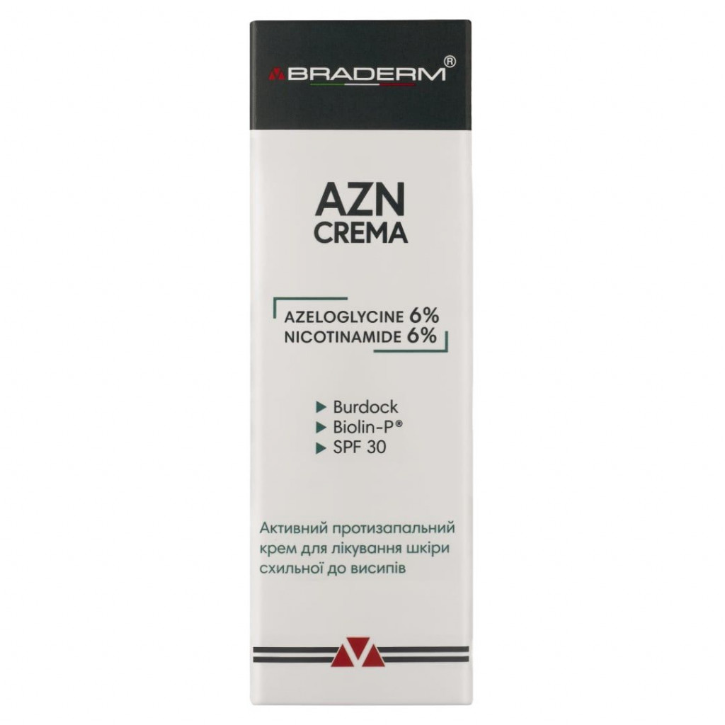 Braderm Azn Cream SPF 30 — денний зволожувальний крем флюїдної текстури SPF 30. Ефективний засіб для комплексного догляду за проблемною шкірою. Поєднує в собі якісне зволоження, захист від сонця і протизапальні властивості, вирівнюючи тон і текстуру епідермісу і повертаючи шкірі виняткову свіжість.