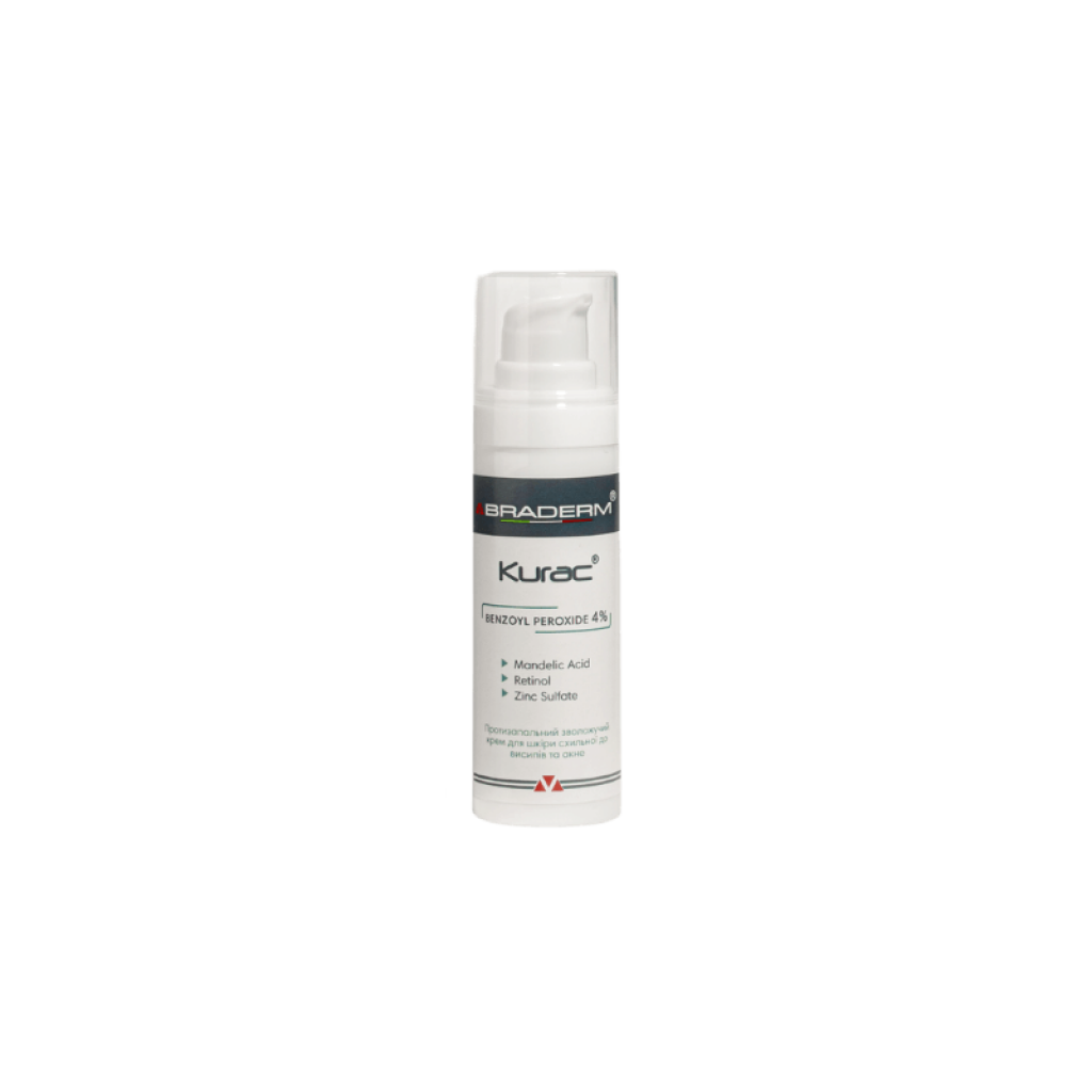 Braderm Kurac Cream - нічний крем з бензоїл пероксидом. Активний протизапальний крем для лікування шкіри схильної до висипів. Інноваційна формула, унікальна на ринку – поєднання бензоїл пероксиду з ретиніл пальмітатом, що дозволяє активу глибше проникати. БП (бензоїл пероксид) зменшує розмір закупорених пор на 50%, а також розщеплює кератин краще, ніж третиноїн і саліцилова кислота. Ще одна перевага – це наявність 18-бета-гліциретинової кислоти та фітосфінгозинів: цей комплекс дозволяє зменшити агресивний вплив бензоїл пероксиду, завдяки чому продукт добре переноситься.