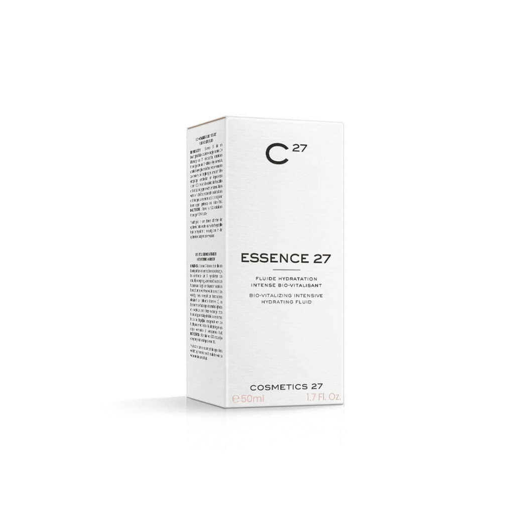Cosmetics 27 Essence 27 - інтенсивний біофлюїд для ревіталізації. Легка нежирна формула швидко проникає в шкіру, насичує її та відновлює запаси вологи. Флюїд містить 5 зволожуючих компонентів, антиоксиданти, екстракт центелли, лізин. Такий склад заповнює резервувари води в шкірі, захищає від окислювального стресу, сприяє регенерації й здоровому тонусу шкіри. Крім того, формула заспокійливо діє на шкіру й знижує вплив екологічного стресу й подразнення.