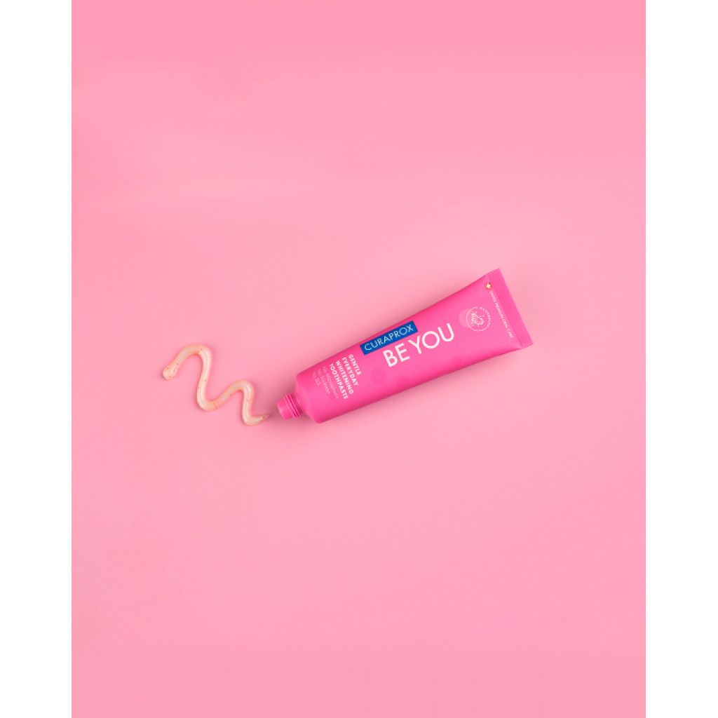Відбілююча зубна паста Curaprox Be you з кольоровими мікрогранулами і незвичайними яскравими смаками ніжно відбілює зуби, видаляє плями, мінералізує пошкоджену емаль та створює заспокійливий ефект для ясен. Паста містить комплекс натуральних ферментів, що входять до складу слини (лактопероксидазної системи ферментів). Завдяки цьому паста підтримує місцевий імунітет порожнини рота, посилює антибактеріальну, ремінералізуючу, очищувальну дію слини. Не містить SLS (лаурилсульфат натрію), триклозан, парабени, штучні підсолоджувачі, барвники, загусники та консерванти. Завдяки відсутності SLS зубна паста CURAPROX не викликає подразнення слизової оболонки, мінімізує ризик виникнення афтозних виразок, не перешкоджає лікувальному ефекту хлоргексидину.