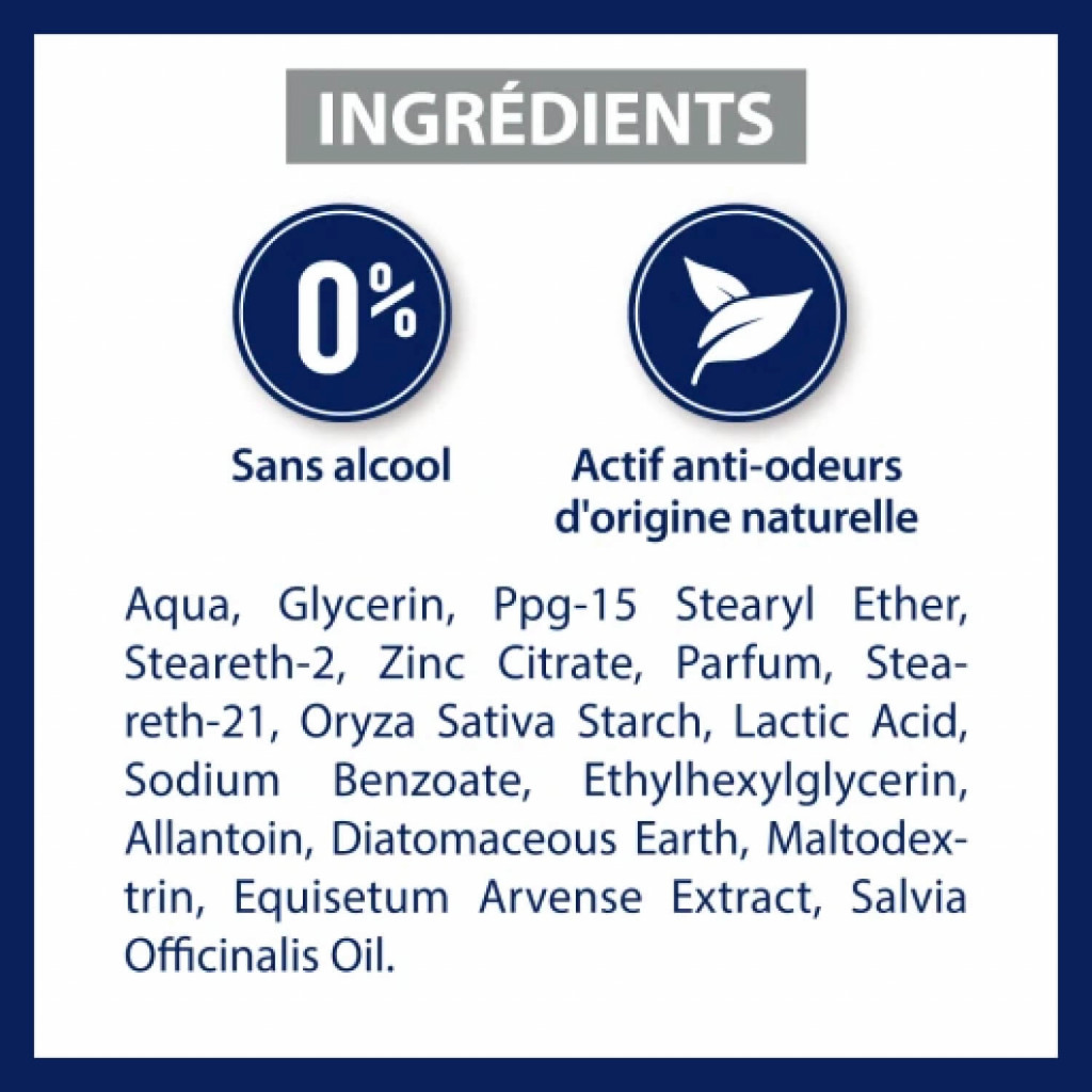 Aqua, Glycerin, PPG-15 Stearyl Ether, Steareth-2, Zinc Citrate, Steareth-21, Parfum, Oryza Sativa Starch, Sodium Benzoate, Ethylhexylglycerin, Lactic Acid, Allantoin, Diatomaceous Earth, Maltodextrin, Equisetum Arvense Extract, Sodium Hydroxide, Tocopherol, Salvia Officinalis Oil.