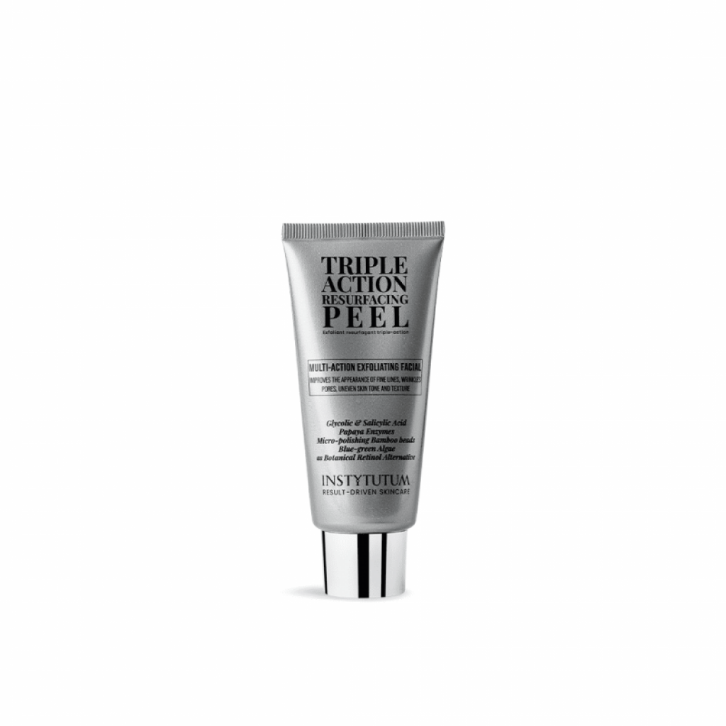 Instytutum Triple Action Resurfacing Peel — делікатний пілінг потрійної дії, що містить 10% кислот, ензими папаї й мікрогранули бамбука, які м’яко оновлюють шкіру, розгладжують зморшки, вирівнюють тон та висвітлюють пігментацію.