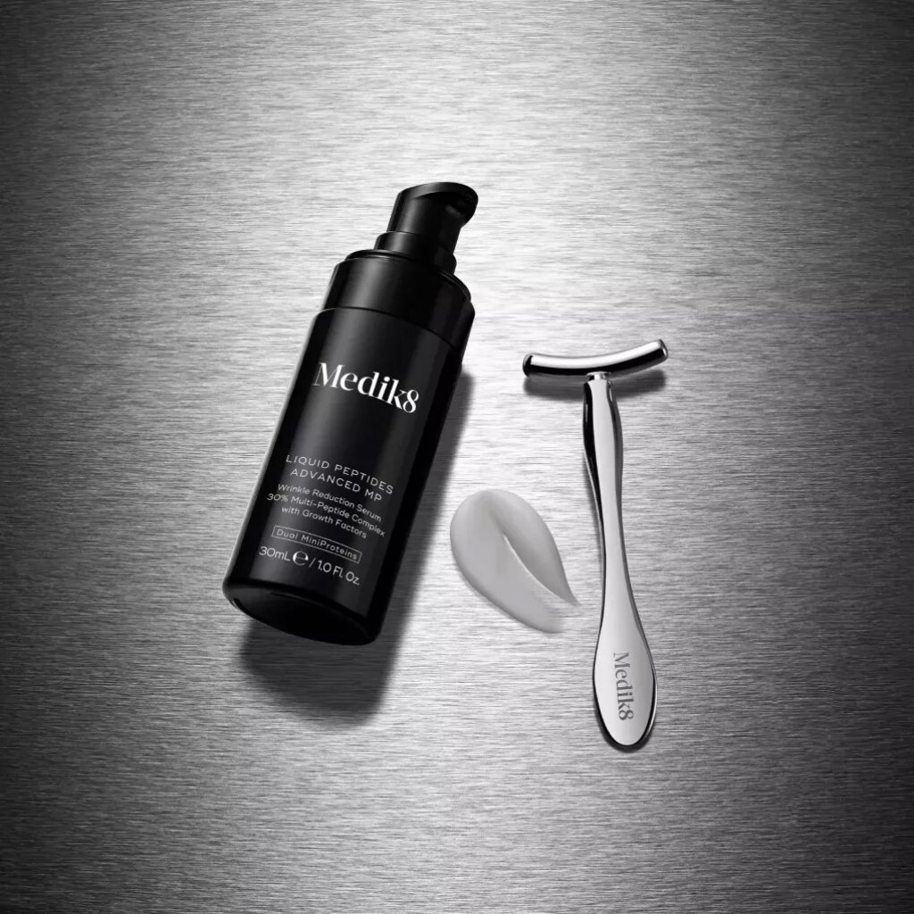 Medik8 Liquid Peptides Advanced MP + Facial Massage Tool — сироватка з проривною біотехнологією Dual MiniProteinsTM у складі для боротьби з ознаками старіння шкіри. Потужна сироватка для обличчя, яка поєднує в собі невагому текстуру, проривну технологію Dual MiniProtein проти ознак старіння, глибоке зволоження та помітне покращення тонусу шкіри.