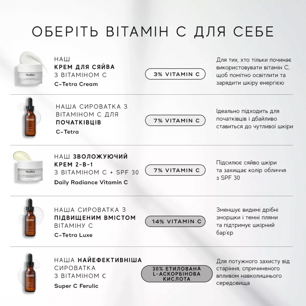 Medik8 Super C Ferulic — інтенсивна освітлювальна сироватка з вітаміном С. Найпотужніша освітлювальна сироватка — для максимального освітлення і сяйва шкіри. Найбільше потужний вітамін С в асортименті Medik8. (Колишня назва продукту: Super C30 Intense).