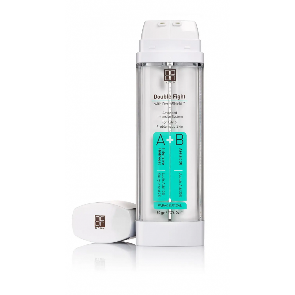 Noon Aestetics Double Fight 50 ml -комбінація лікувального гідрогелю (10% молочної кислоти + 2% саліцилової кислоти) та Azelaic 20 Cream (20% азелаїнової кислоти) з COSMEDERM-7™ (міжнародний патент) для зменшення характерного подразнення від застосування кислот.