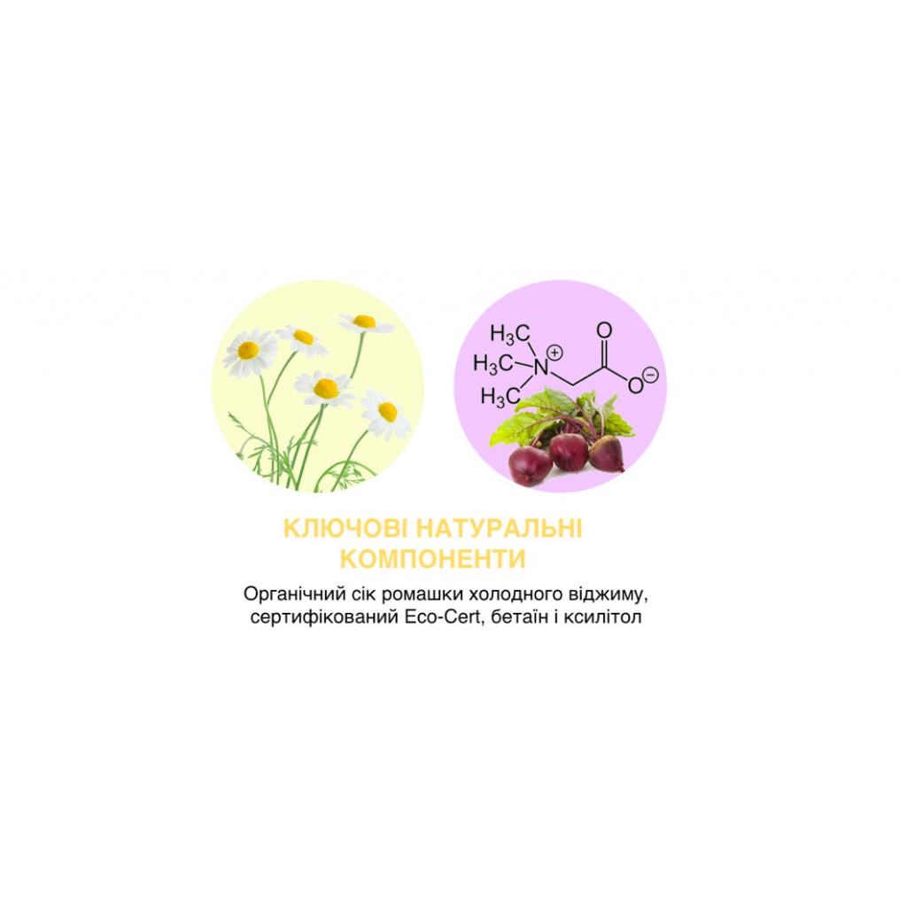 Органічний сік ромашки, бетаїн і ксилітол забезпечують глибоке зволоження та живлення для підтримки здоров'я шкіри голови та волосся.
