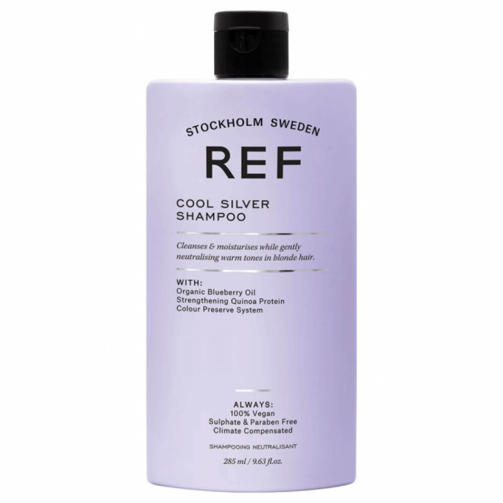 REF Cool Silver Shampoo - шампунь для світлого волосся. Створений для дбайливого догляду за забарвленим, сивим, освітленим і натуральним світлим волоссям (рівня 8 і вище). Він є безсульфатним шампунем із тонувальним ефектом, легко розподіляється по шкірі голови та волоссю та забезпечує гігієну та додатковий догляд. Незважаючи на те, що засіб містить олії, він не робить волосся сальним, а навпаки — забезпечує прикореневий об'єм, чистоту та легкість.