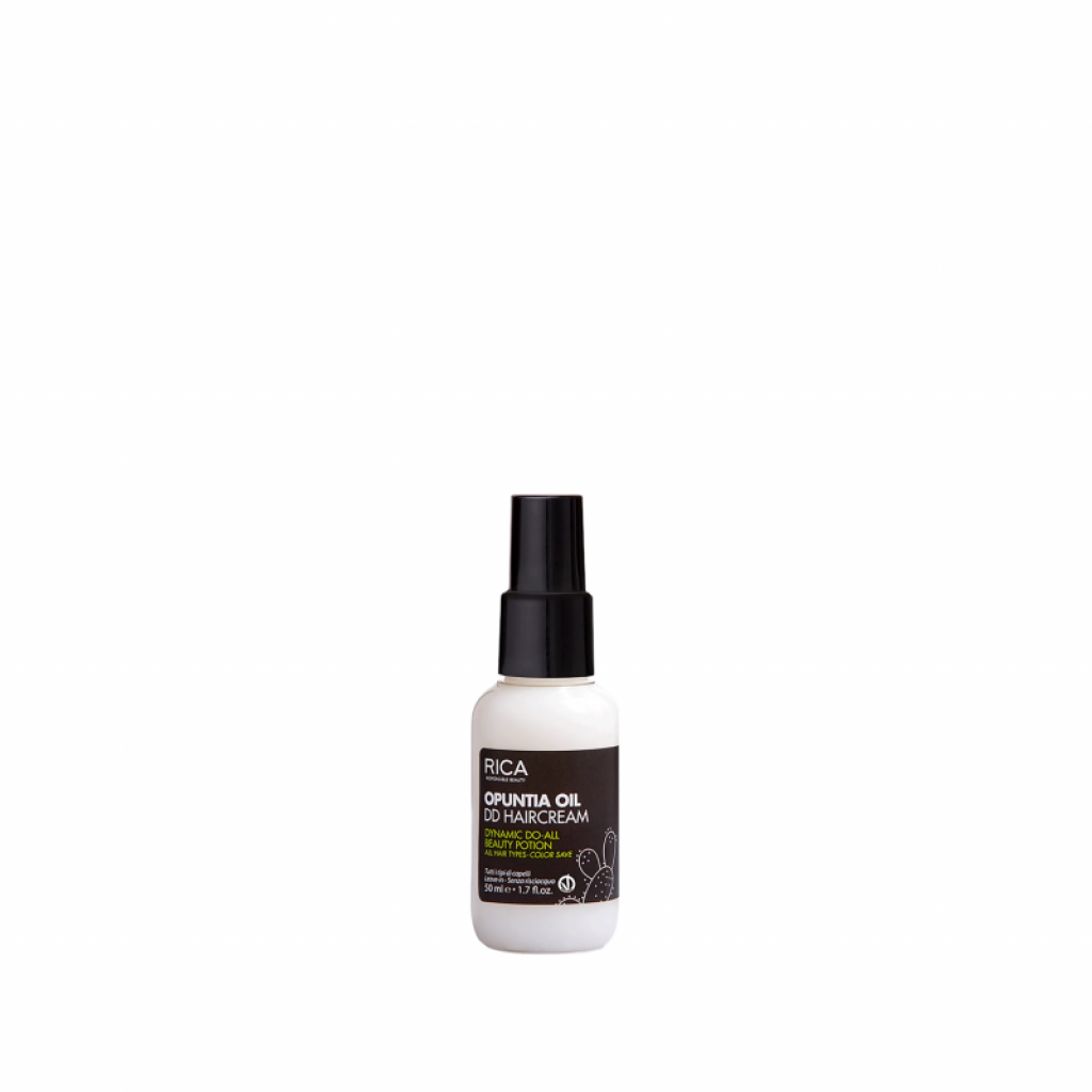 RICA Opuntia Oil DD Haircream – незмивний крем для волосся з вмістом олії опунції. Мультиефективна формула глибоко зволожує, пом'якшує локони, запобігає їх сплутуванню. Захищає від агресивної дії гарячих інструментів та УФ-випромінювання. Олія опунції зміцнює природні барʼєрні функції, заспокоює запалення й подразнення, утримує вологу в клітинах. Протеїни пшениці сприяють формуванню білка кератину, відновлюють пошкоджені пасма.