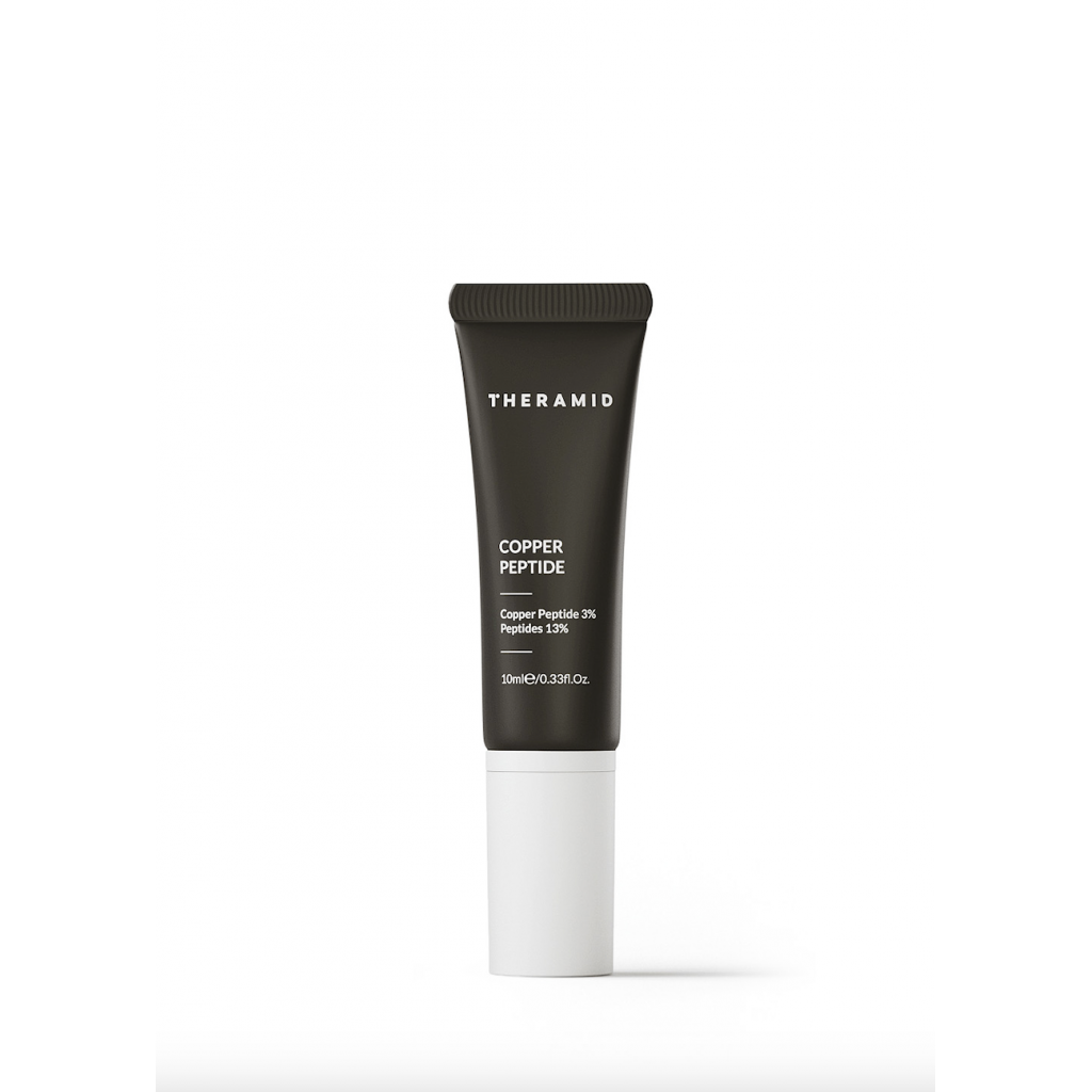 Theramid Copper Peptide. Продукт містить комплекс пептидів, який стимулює вироблення колагену та еластину, покращує пружність шкіри та зменшує ознаки старіння. Гіалуронова кислота відновлює рівень вологи в шкірі, зволожує та насичує поживними компонентами. Лецитин запобігає появі запалень і стимулює регенерацію клітин. Регулярне використання сироватки покращує загальний стан і зовнішній вигляд шкіри.