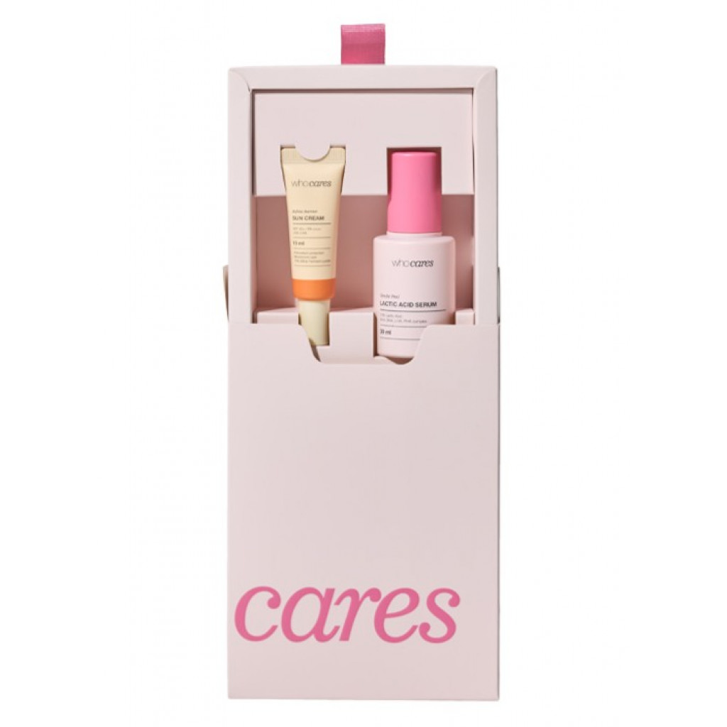WhoCares Gentle Peel Lactic Acid Serum x Bifida Barrier Sun Cream — набір засобів для обличчя. Цей сет – мастхев у догляді за шкірою, а також чудовий варіант на подарунок, як для себе, так і для близької людини.