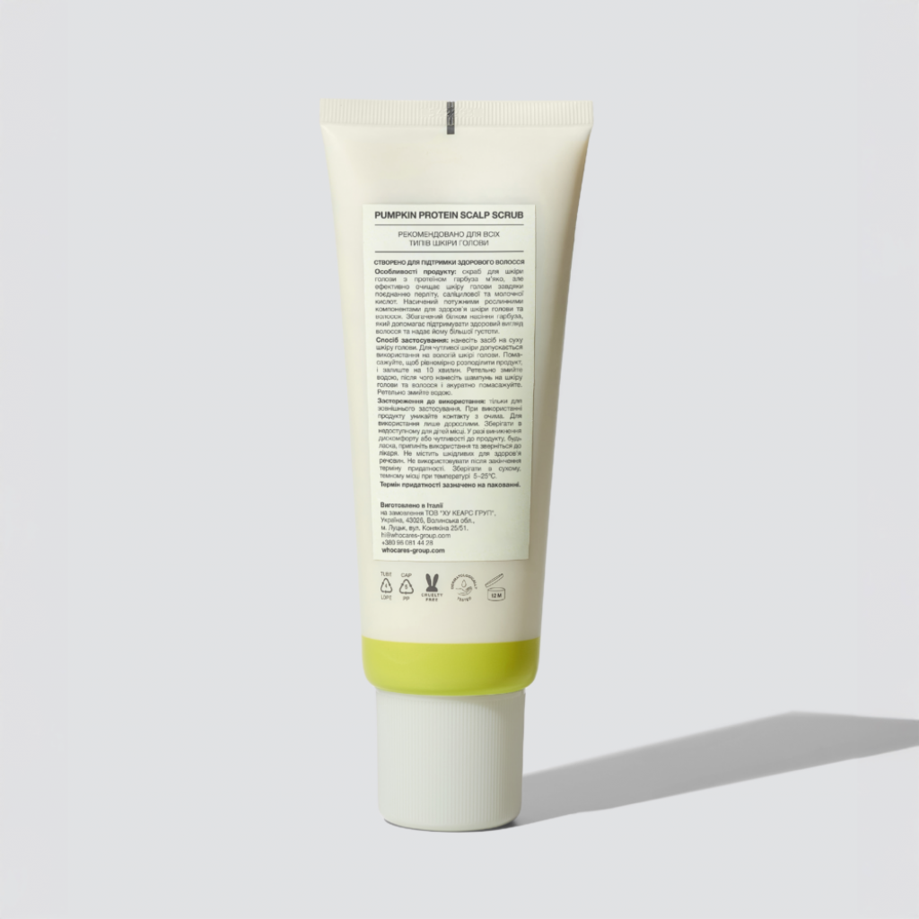 WhoCares Pumpkin Protein Scalp Scrub — кислотний скраб-пілінг для шкіри голови. Це перезавантаження для шкіри голови завдяки подвійній ексфоліації.