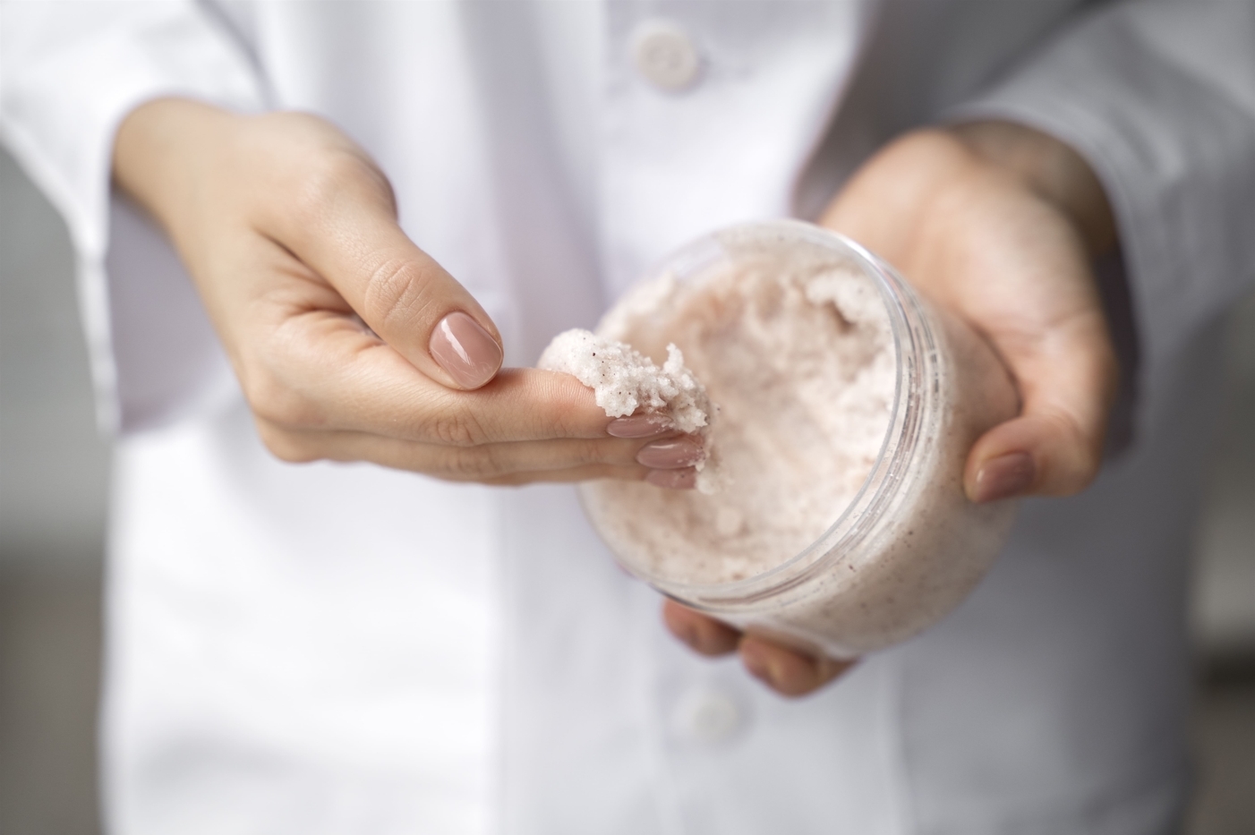 Скраб — це засіб із механічними частинками (сіль, цукор, подрібнені абразиви), які фізично очищають шкіру. Він забезпечує відлущування через тертя та стимуляцію мікроциркуляції.