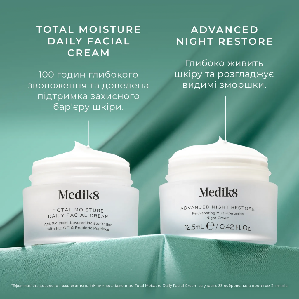Вдень — Total Moisture Daily Facial Cream, що показав покращення стану шкіри вже за 1 годину після використання. Він робить її більш м’якою на дотик, розгладжує та захищеною від щоденних стрес-факторів, забезпечуючи комфорт і тривале зволоження.