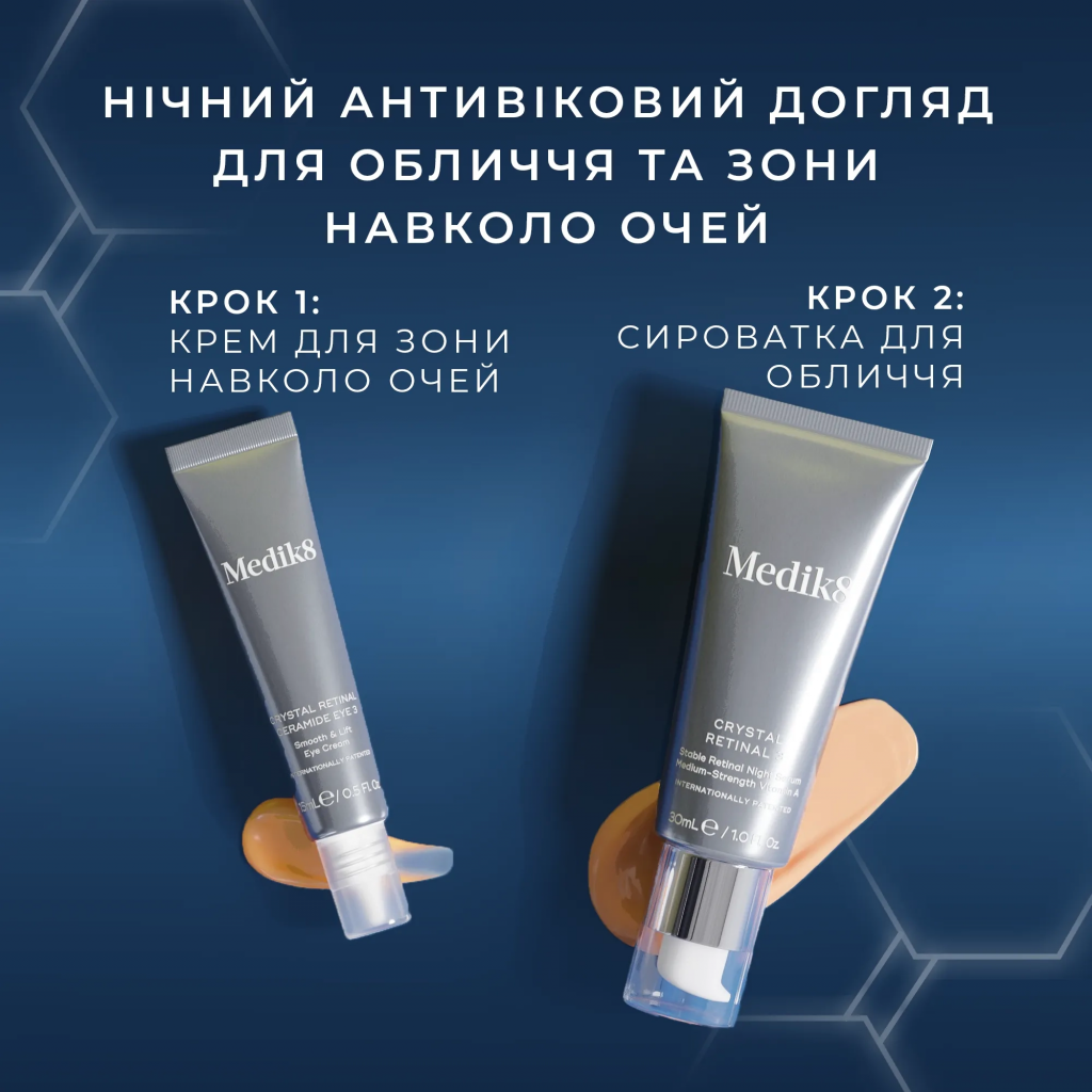 Поки сироватка Crystal Retinal 3 помітно розгладжує, освітлює та покращує текстуру шкіри обличчя, крем Crystal Retinal Ceramide Eye 3 розгладжує «гусячі лапки», дрібні зморщки та зменшує набряки в зоні навколо очей.